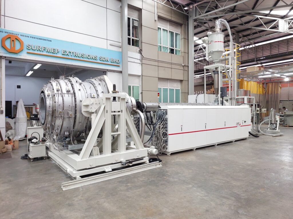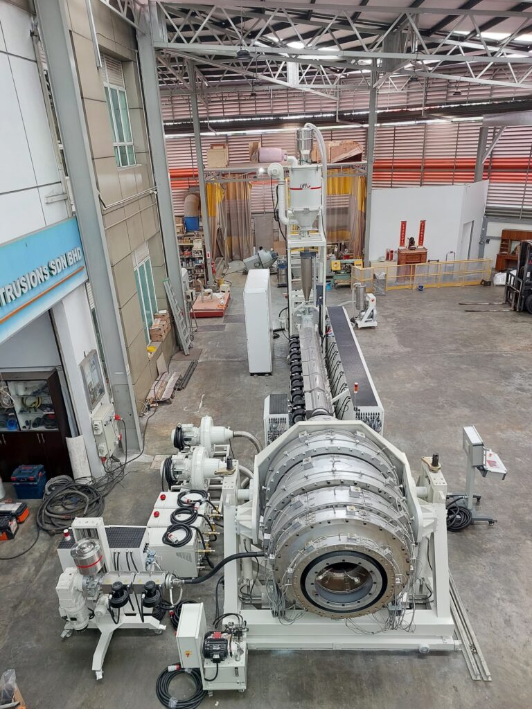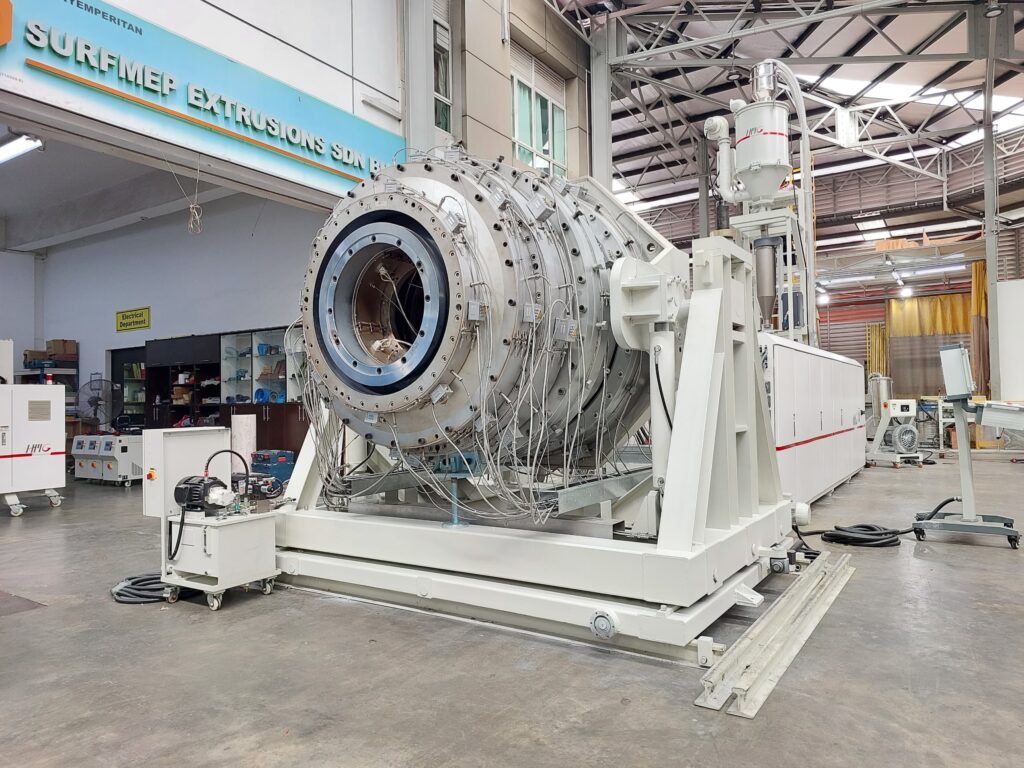 HMG Extrusions latest technology was implemented supplying our Single Screw Extruder type LUMEN120/38 to achieve optimum melt homogeneity without sacrificing on the output which can achieve a maximum of 1500 kg/h. Our new development of large size Polyolefine Pipeheads using Spiral type channels made out of a special alloy material guaranteeing smooth operation, easy and fast start and tight tolerances for each pipe size from 630 – 1200mm.